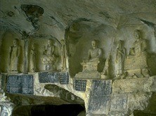 Continue to Fubo Hill. Partially submerged in the river, it was named for General Fubo of the Tang Dynasty, and was the site of his Mayuan Temple. Because of its height, the hill is said to tame the waves and stop surging waters, which then form whirlpools. Climb almost 350 steps for a bird's eye view of Guilin. The steps beside the Sword Testing Stone wind their way to the 1,000 Buddha Cave, site of more than 200 Tang Dynasty Buddha statues.